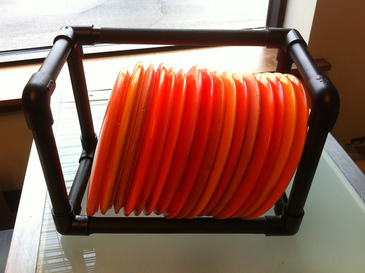 I had to make a few modifications. I built a half-inch PVC frame to keep the bottom compartment that held the tackle boxes rigid. With the frame, I can carry about 19 discs. Without the frame, even more can be stored. I only carry 14 discs.