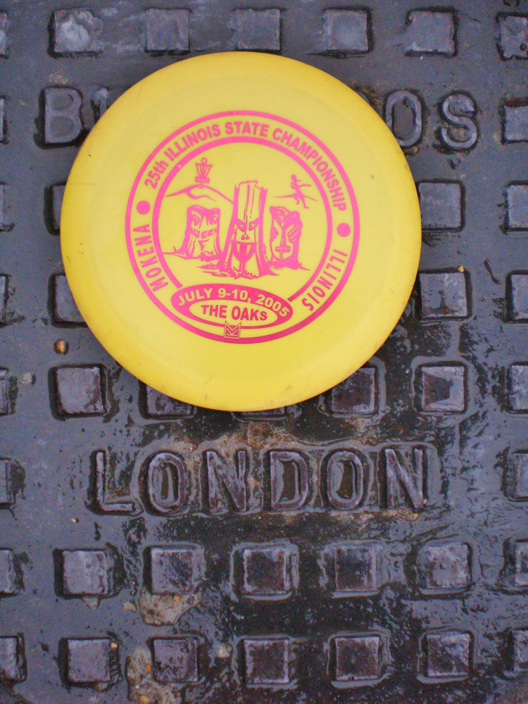 The photo of the London sewer top helps me remember my long daily walks and the rain, which I actually enjoyed. The stamp on the disc helps me remember my first win in the Advanced division.