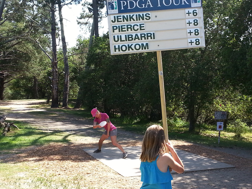 I had figured on watching about an hour or so of the action. But my daughter — who at first rooted for Pierce after the lesson, but then switched allegiance to Jenkins once she realized that Val and I were in Discmasters together — insisted on sticking it out for the full round, which lasted about 4 hours, 30 minutes.