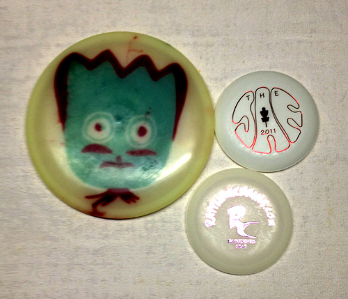 This month, we’re handing out some glow plastic. That includes an Innova Aviar (big-bead), with some custom art by Rattling Chains crew member Darren Dolezel. We also have two glow minis — a Rattling Chains one and one from the 2011 New Jersey Jam, donated by professional Bob Graham.