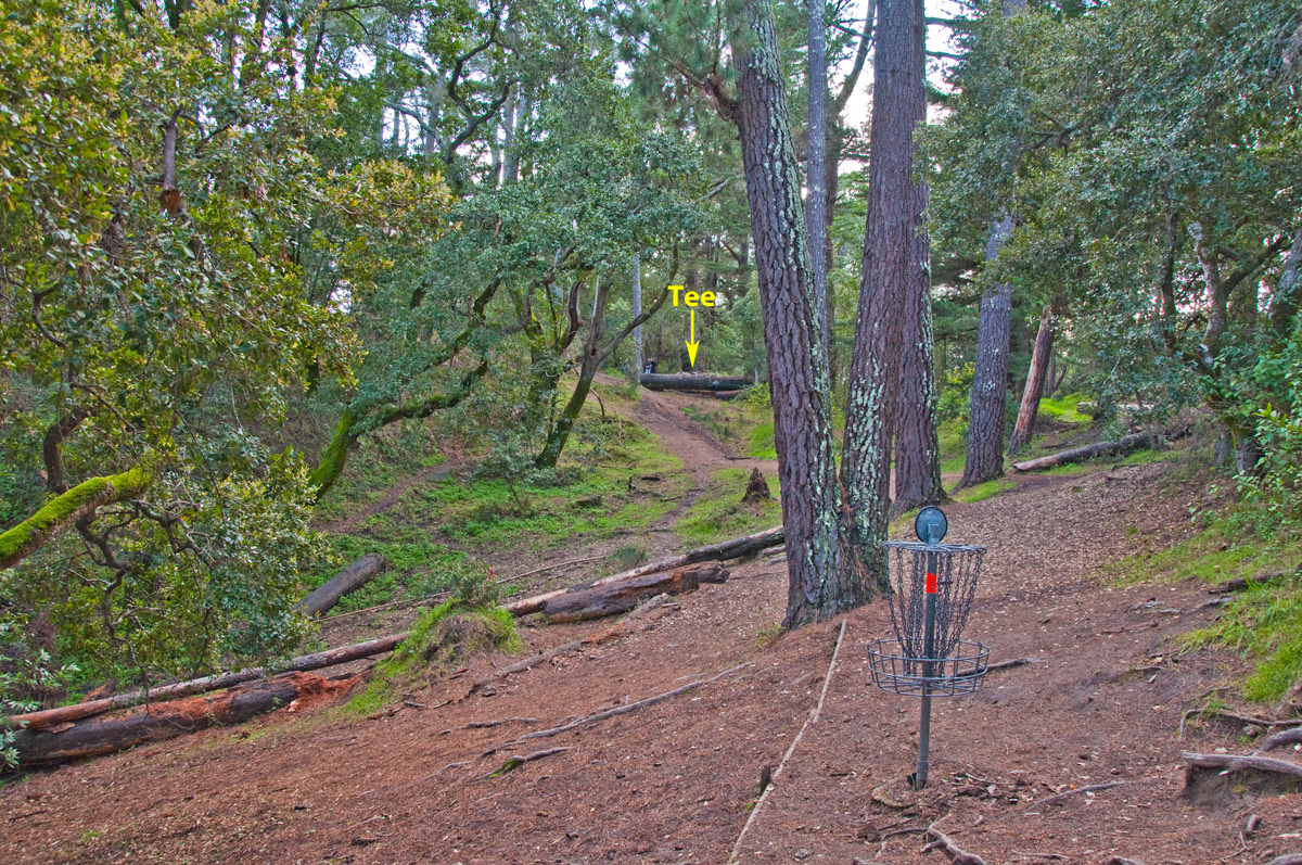 Hole No. 17, The Gravity Hole, at DeLaveaga. Note how the hole plays downhill as well as sloping right-to-left (looking back toward the tee). (photo by John Hernlund)