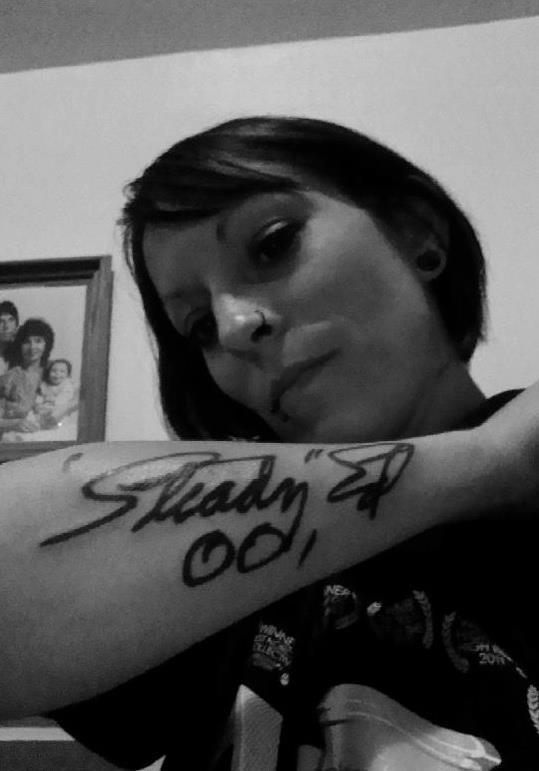 That’s where, adorned for all to see, is a tattoo of the signature of “Steady” Ed Headrick, the father of disc golf. As a DGA-sponsored player, the tattoo makes sense.